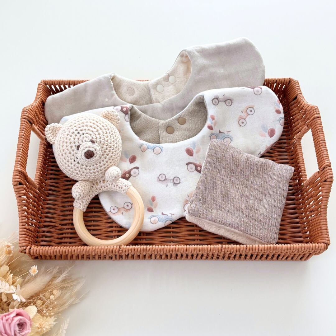 ベビー 男の子 出産祝い ギフト プレゼント 贈り物 出産準備 8重ガーゼスタイ 6重織ガーゼ プチギフト 歯固め くまさんラトル ラトル ファーストトイ くるま